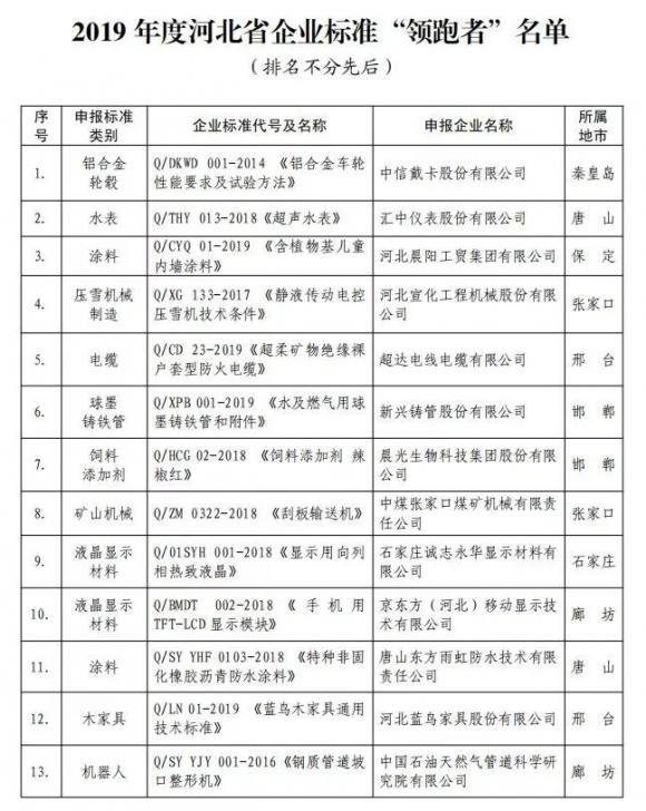 日前,河北省市場監(jiān)督管理局發(fā)布《2019年度河北省企業(yè)標準“領(lǐng)跑者”名單》,晨……